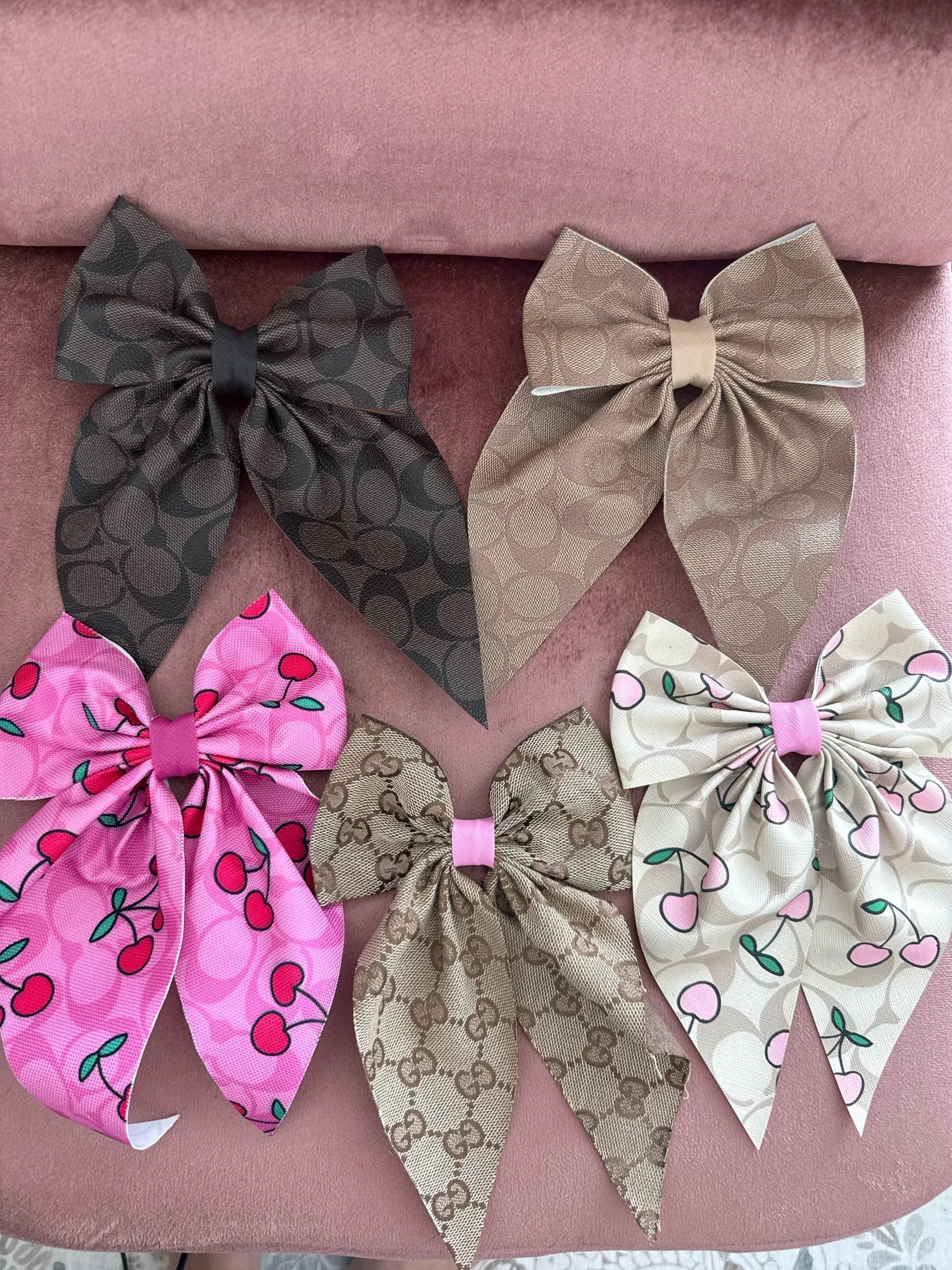 Shop Everything › Big bow on clip Image 1 of 1 Big bow on clip $12.00 Style: Dark brown coach Light brown coach Pink cherry with pink Tan with pink cherry Gg Add To Cart Added!